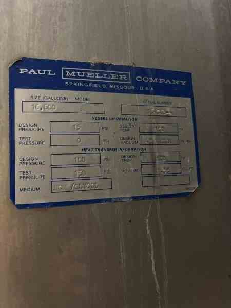 Used 16600 Gallon 304 Stainless Steel tank, jacketed, cone bottom. Manufactured by Mueller. Dished head. 10' 1 7/8" OD x 36' 11 3/8" Tall. Shell rated 15 psi @100F. Jacket rated 100 psi @100F. Weight 13200 lbs. Built 1995. Serial #164563-4. Previous use: 400 BBL brewery fermentation vessel.