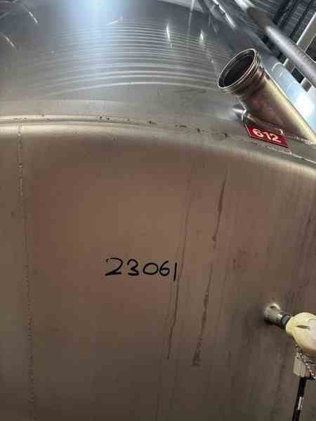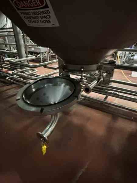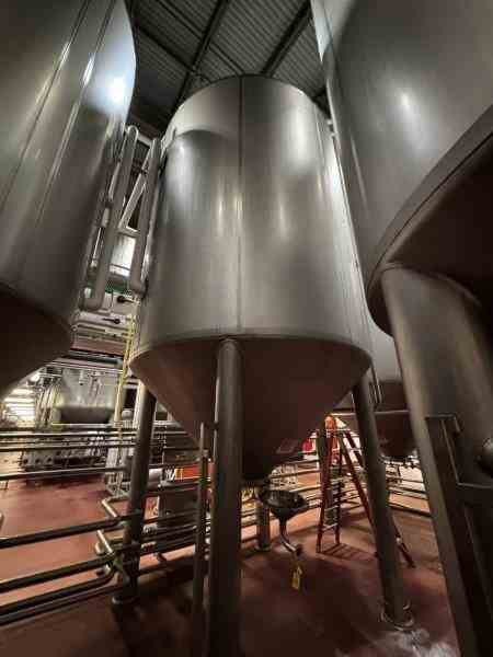 Used 8300 gallon 304 Stainless Steel tank, jacketed, cone bottom. Manufactured by Mueller. Model F. Internal 15PSI@100F. Cooling Jacket 100PSI@100F. Dome top. Previous use: 250 BBL Brewery Brite Beer Tank.