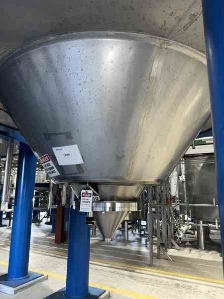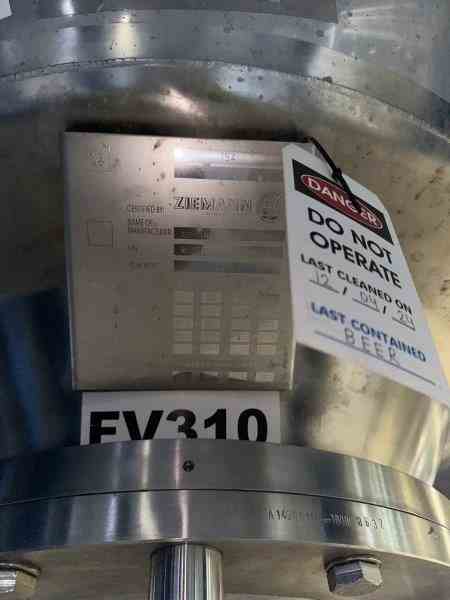 Used 9300 gallon (300 BBL) 304 stainless steel jacketed pressure vessel. Manufactured by Ziemann Bauer GmbH. Vessel Rated 29psi @86F, jacket rated 43psi @86F. 10' 2" dia x 30' tall. Dished head, cone bottom.Previously used in brewery as fermenter, cooled with Glycol @24F. National board #154. Serial #8632-14300129/1000. Built 2012.