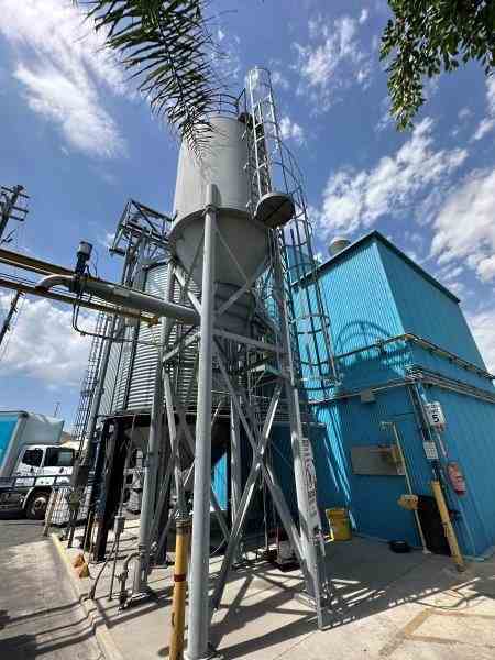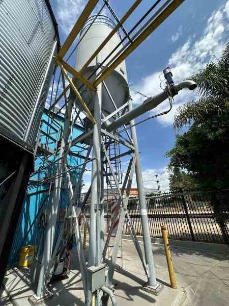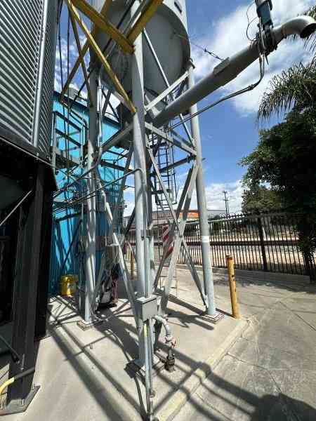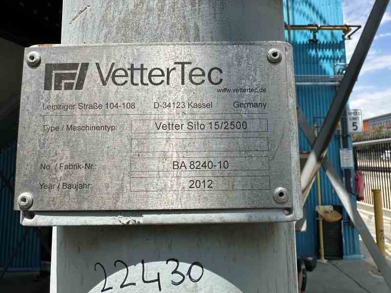 Used metal grain silo. Built by VetterTec. Serial #BA 8240-10. Previously used in brewery.