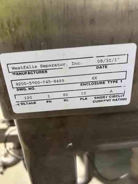 Used GEA Westfalia Separator/Disc Centrifuge. Model GSE 125-06-777. 5900 rpm bowl speed. 1,10 kg/dm3 heavy liquid. Rated 14.5 psi @194F. 1.26 kg/dm3 solids. Serial #1731-307. Skid dimensions: W- 7’8” x L-10’ x H-7’. Built 2011.