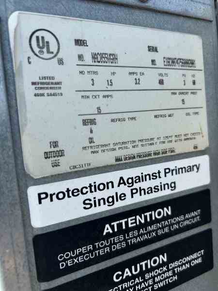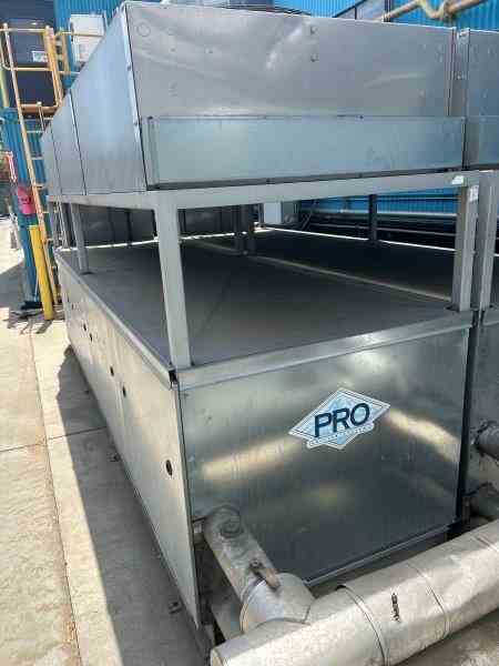 Used 4.5 HP glycol chiller, manufactured by Pro System. Model #NAC-55-G. max design pressure (high side) 450 psig, refrigerant saturation pressure 450 psi @125°F. (3) 1.5HP electrical motor, 3Phase/60Hz/460V each. Past use in brewery.