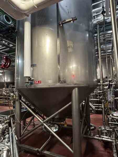 Used 4340 Gallon Stainless Steel jacketed pressure vessel. Built by Mueller. Dome Top, cone bottom. (4) leg mounted. Shell rated 15 psi @100F, jacket rated 100 psi @100F. Serial #127374-2. Past use DA tank in a brewery.