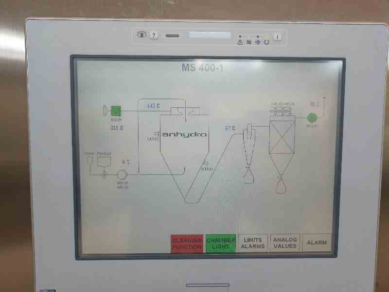 Used 45"D 304 Stainless Steel Small Scale Spray Dryer. Manufactured by Anhydro. Model MicraSpray 400. Nozzle Atomizer throughput up to 60 l/hr. Max air pressure 5.6 bar. Max air temp up to 320C. 50Hz. Past use Milk Whey powder.