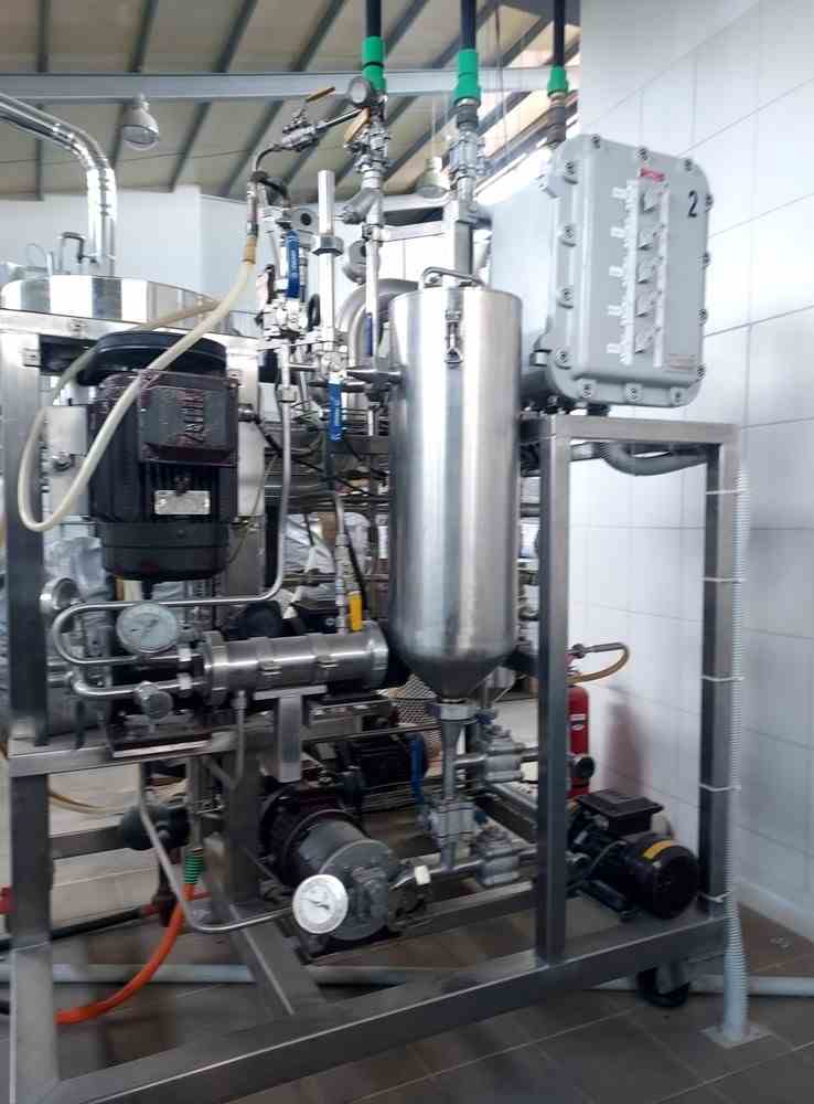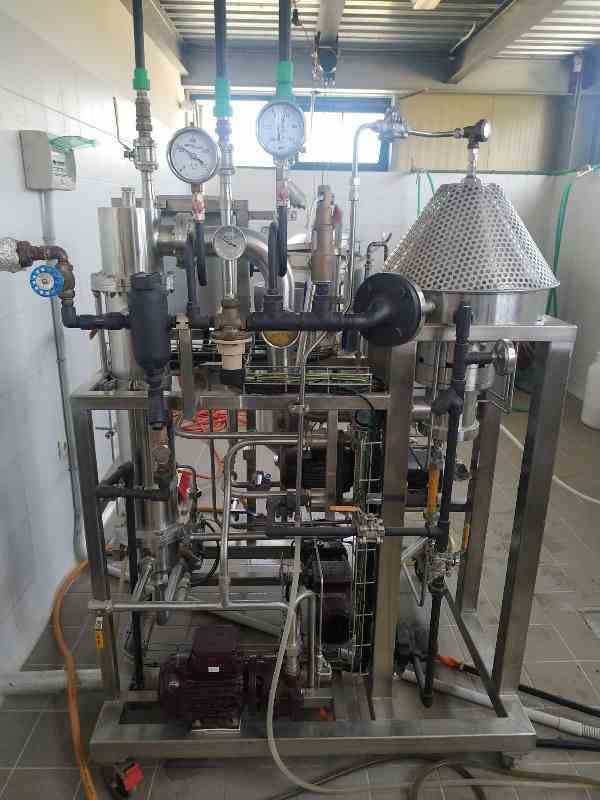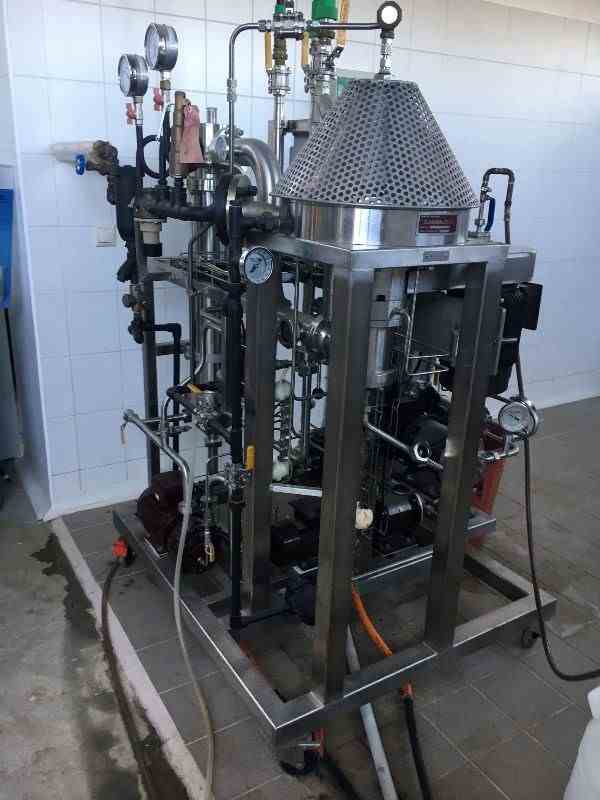 Used Centritherm stainless steel single-effect centrifugal Evaporator. Manufactured by Flavourtech. Model CT1-09RM. Evaporation capacity 63 kg/hr water. 50kg/hr Sugar solution 12-65 Brix. Includes pumps, motors, controls, heat exchangers. Skid mounted.