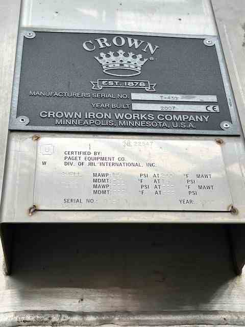 Unused 23000 gallons Vertical 304L Stainless Steel Vessel. Manufactured by Crown Iron Works (Pagent Equipment). Rated 15 psig @ 250F. Dished Heads. Lug Ring Supports. 30'6" Overall Length. 20" Top Manway. National Board #22547. Serial #06-461. Built 2007.