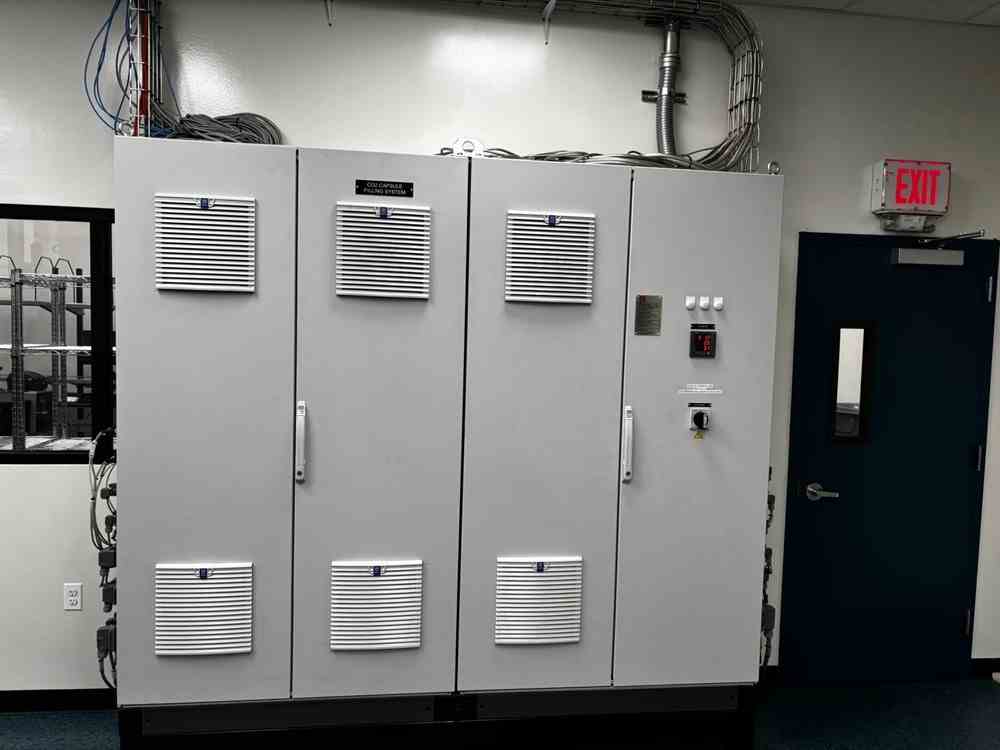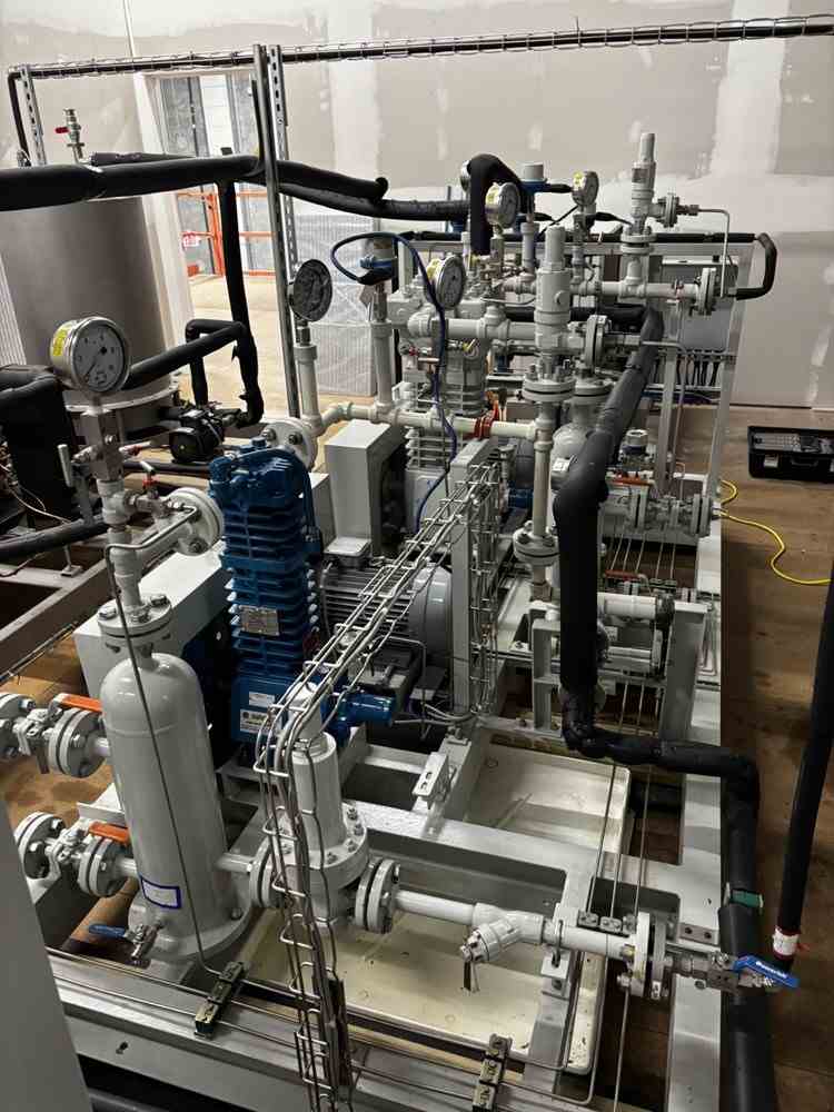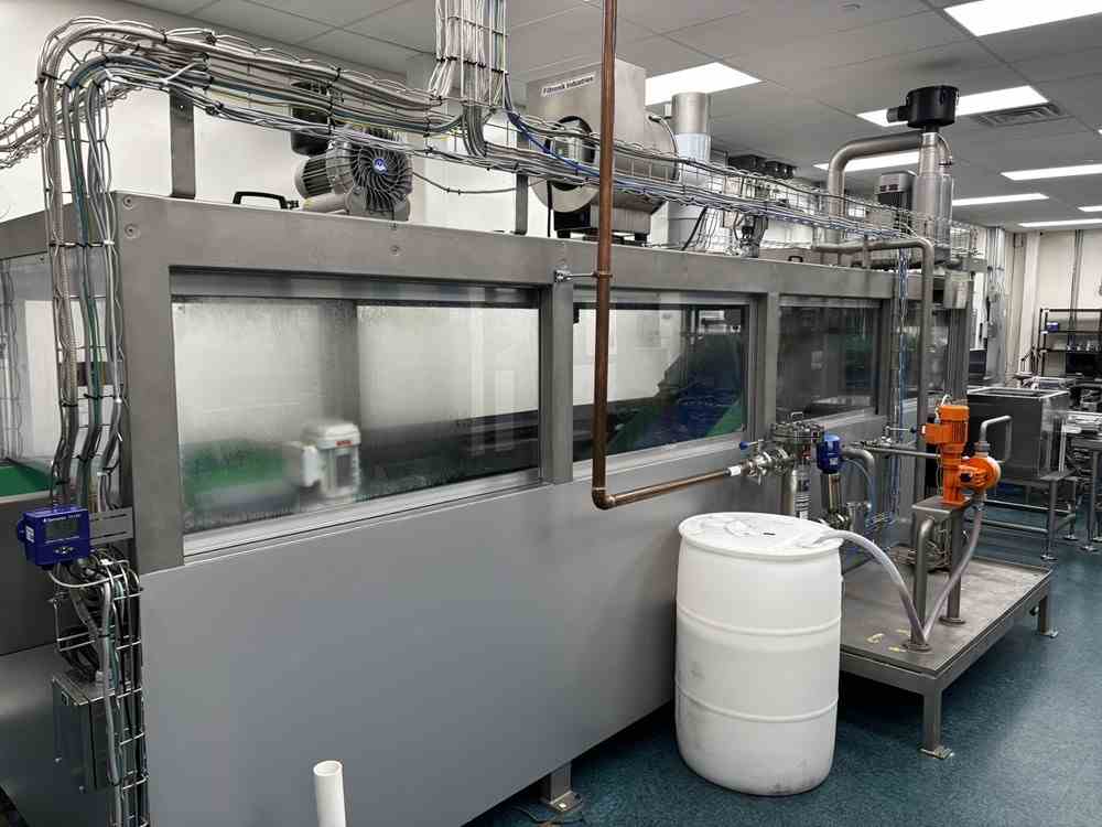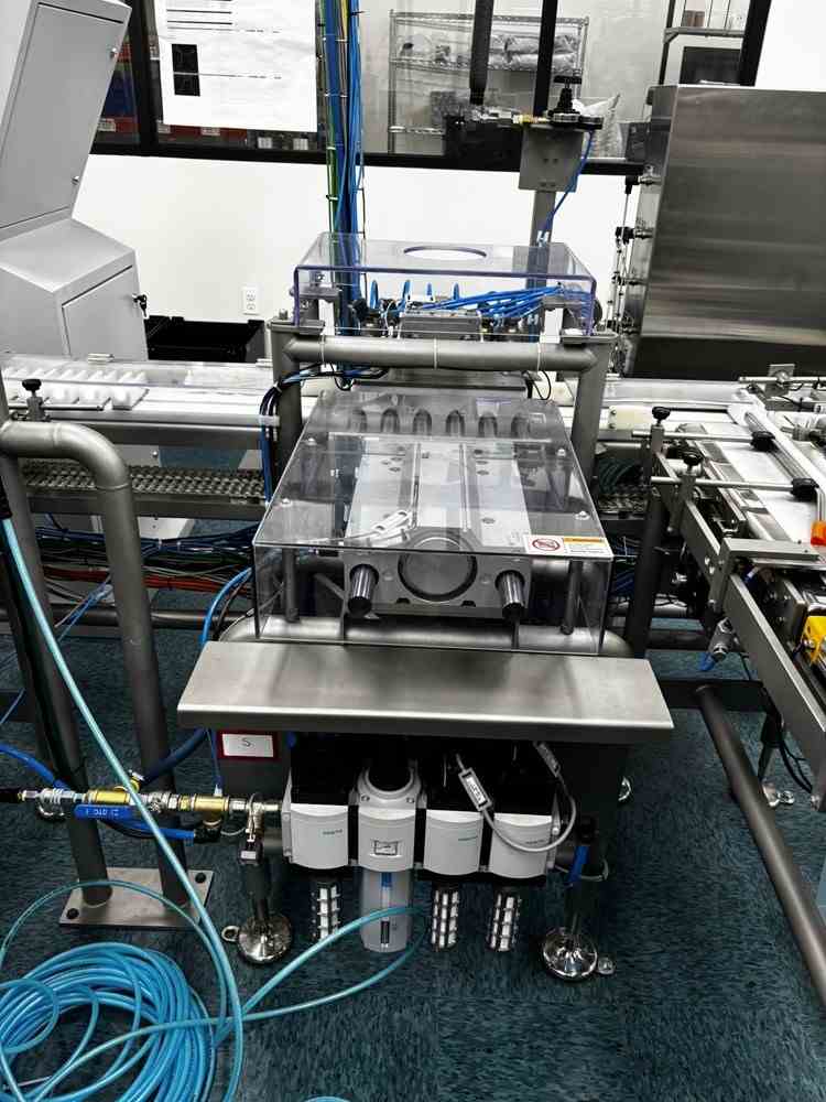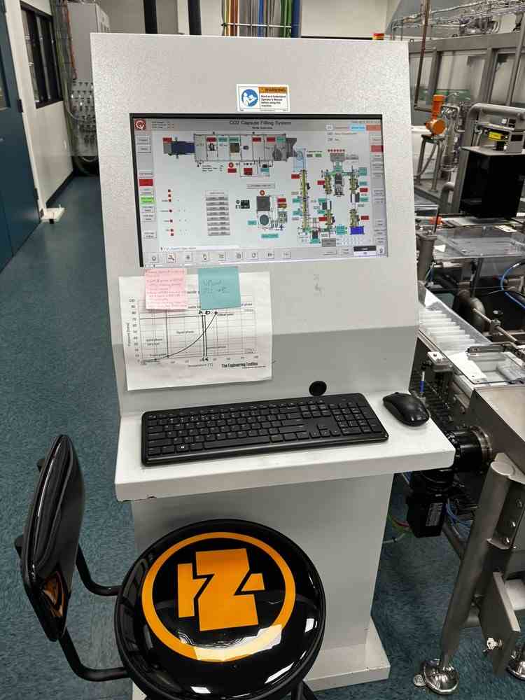 Used 12.5g CO2 cartridge filter filler system. Manufactured by Cybernetik. 500 gallon CO2 filling plant cleaning tank with detergent feed, air injection, drying, defogger and capsule orienter. Co2 cleaner and capsule charger. Capsule filler, scales with IR inspection. (2) Antrisu Checkweigher SSV series with HMI. Includes Electric cabinet. Control station with HMI and SCADA. Clean air skid with Danfoss chiller and (2) Blackmer Compressors on skid. Includes Hertz compressor Model HBD 15125 PSI with Refrigerant dryer model HRD-US 80.