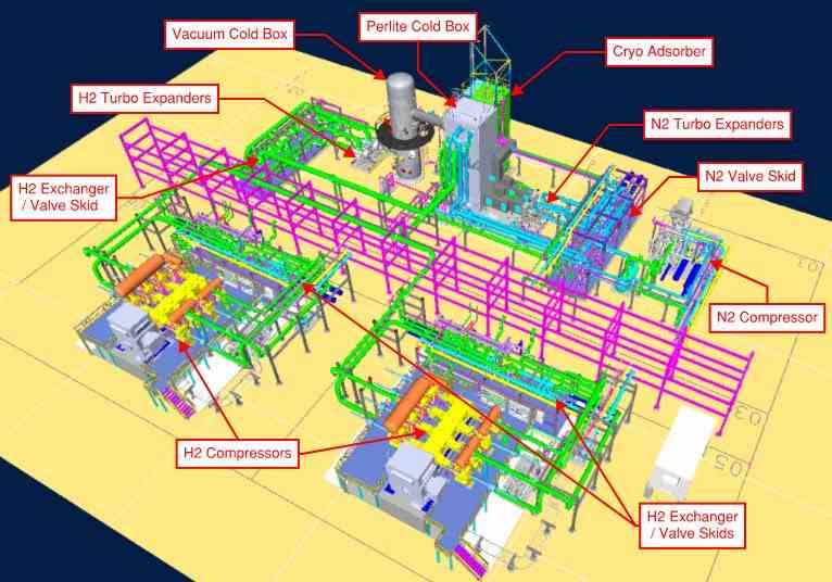 A single-train hydrogen liquefaction plant designed by Plug Power converts hydrogen feed gas into >99.999% pure liquid hydrogen.